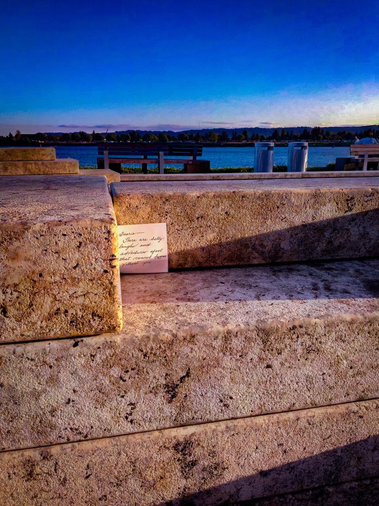 I love walking along the river around sunset, or a bit afterward as the evening begins cooling down. With all its new construction, tasting rooms and restaurants, the newer section of the Vancouver Waterfront is certainly a good opportunity to observe people, and study how humans engage with one another, so it seemed an excellent spot to stash a ‘Dearie’ note.